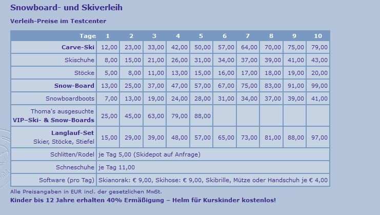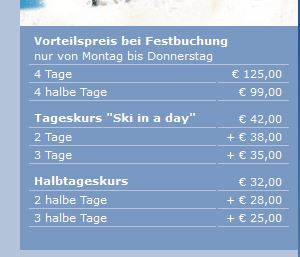 課程 ski 一天 42歐 第二天 38歐 第三天35歐